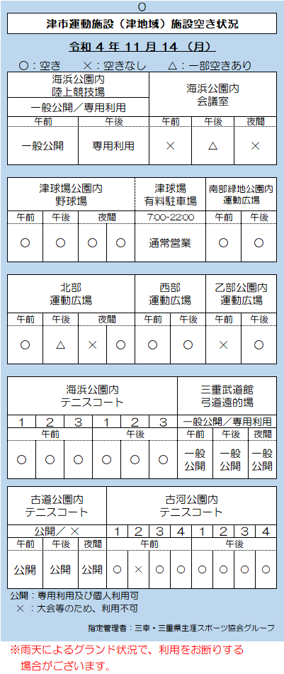 津市運動施設(津地域)空き状況 11.14