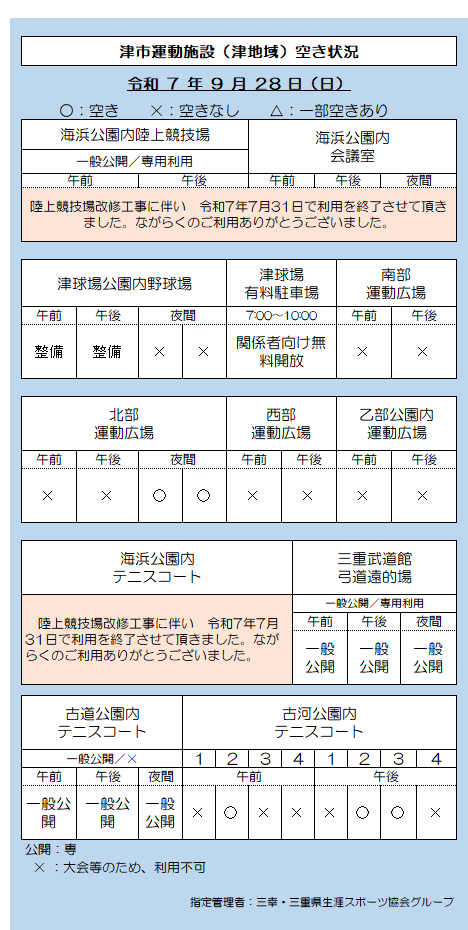 津市運動施設(津地域)空き状況 9.28