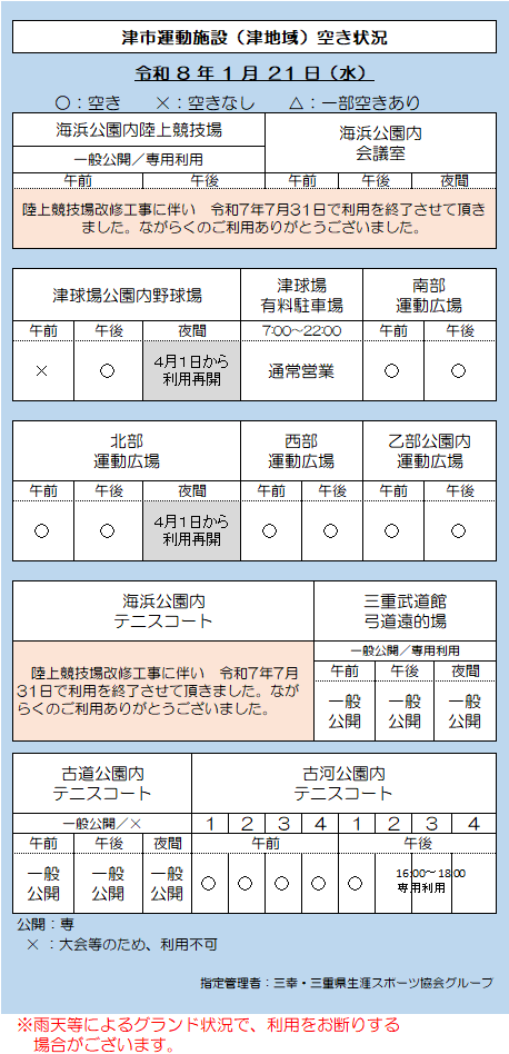 津市運動施設(津地域)空き状況 1.21