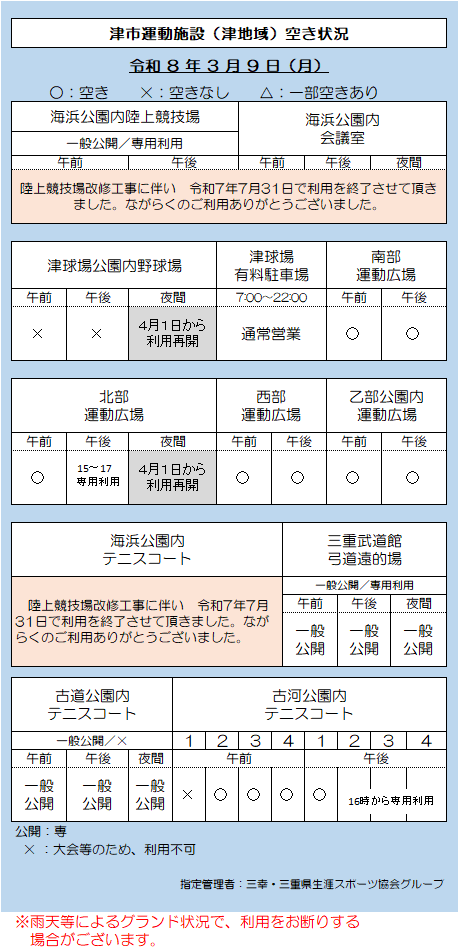 津市運動施設(津地域)空き状況 3.9