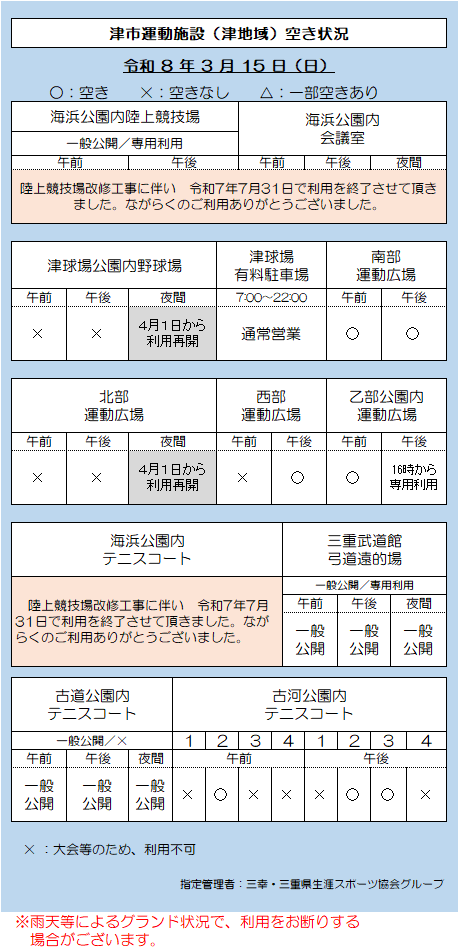 津市運動施設(津地域)空き状況 3.15