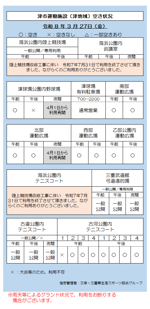 津市運動施設(津地域)空き状況 3.27