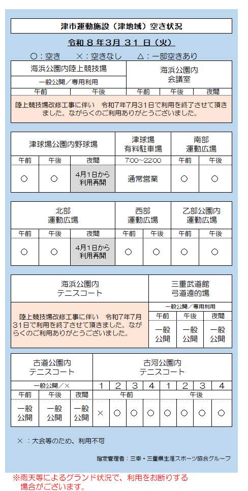 津市運動施設(津地域)空き状況 3.31