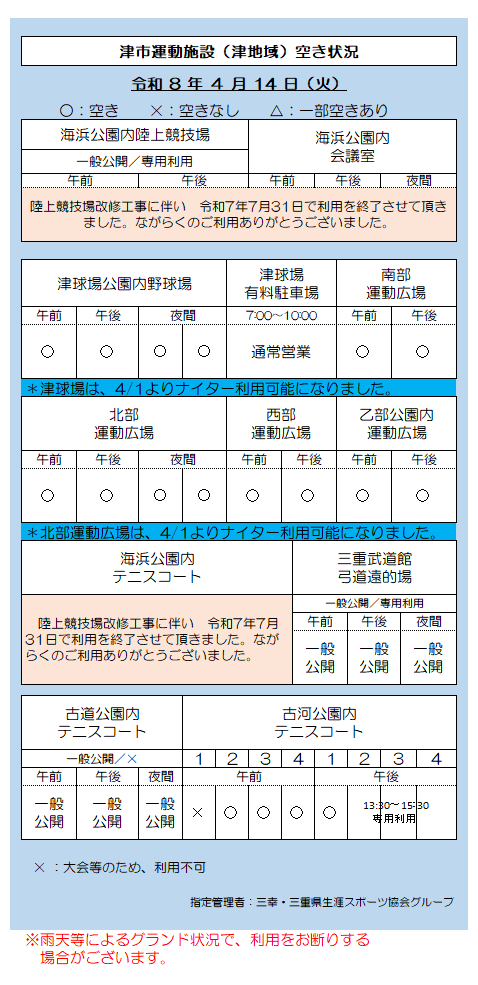 津市運動施設(津地域)空き状況 4.14