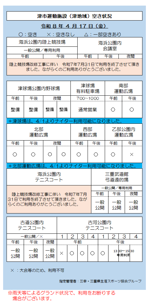 津市運動施設(津地域)空き状況 4.17