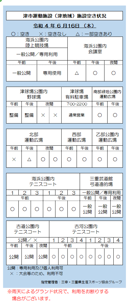 津市運動施設(津地域)空き状況 6.16